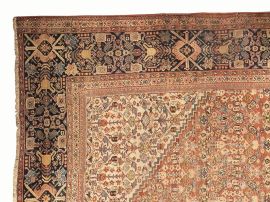 Tappeto persiano Mahal, metà sec. XIX, fondo rosso mattone cosparso da piccoli decori floreali avorio, azzurro, cantonali avorio, bordura blu a disegni geometrici avana, azzurro e rosa, cm 680x420
