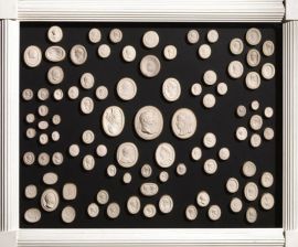 Trecentodue piccoli calchi di cammei, sec. XIX , tratti dall'antico, in gesso, entro tre cornici in legno laccato bianco, cm 44x54 (3)