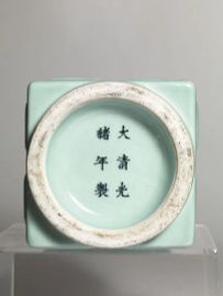 Coppia di vasi, Cina dinastia Qing, sec. XIX, in porcellana céladon a sezione quadrata, con decori geometrici a rilevo, recano marchio sul fondo periodo Guangxu (1875-1908) alt. cm 29,5 (2)
