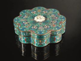 Grande contenitore, Cina sec. XVIII-XIX, in metallo cloisonné, dalla forma circolare polilobata decorata con simboli e motivi vegetali e floreali, la parte centrale del coperchio decorata con placca in giada intagliata con un drago, l'interno del contenitore anch'esso decorato con smalti raffiguranti pipistrelli tra nuvole stilizzate, diam. cm 33