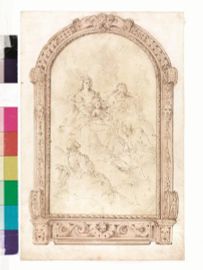 Penna e inchiostro bruno e acquerello rosa su carta vergellata con parziale preparazione in giallo con filigrana “Quadrupede entro un cerchio singolo sormontato da lettera P”. mm 405x270.