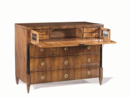 Cassettone scrivania, Italia centrale, prima metà sec. XIX in ciliegio con parti ebanizzate, primo cassetto aggettante con fronte a calatoia e scarabattolo interno con cassetti e vani a giorno, tre cassetti sottostanti inquadrati da lesene stilizzate, gambe troncopiramidali, cm 128x62x100