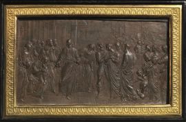 Coppia di placchette, Francesco Putinati, prima metà sec. XIX, in piombo patinato a rame, rispettivamente raffiguranti L'ultima cena e Cristo e l'Adultera, entro cornici in legno ebanizzato e bronzo dorato, cm 17x11. Sul retro etichetta originale in carta, Fran.Co Putinati Incisore di medaglie in Milano Contr. Della Passarella, n. 509, entrando dal Corso 3° porta a dritta (2)
