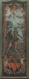 Sei ante di paravento, sec. XIX, in tela dipinta a raffigurare scimmie suonatrici entro riserve e quinte arboree, entro cornici in legno dipinto, cm 172x63, alcuni restauri (6)