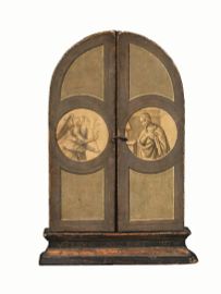 ALTAROLO RAFFIGURANTE NELLA PARTE CENTRALE LA VERGINE ADORANTE IL BAMBINO, ALL’INTERNO DEGLI SPORTELLI LATERALI SAN PIETRO MARTIRE E SANTA CATERINA DA SIENA, ALL’ESTERNO ANGELO ANNUNCIANTE E VERGINE ANNUNCIATA DIPINTI A MONOCROMO