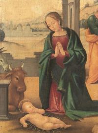 Per quanto riguarda invece lo stile, l’opera dichiara la sua derivazione da modelli di Domenico Ghirlandaio, in particolare la grande Adorazione Sassetti dove, seppur speculare, vi è il medesimo rapporto fra la Vergine e il Bambino poi replicata in numerose derivazioni della bottega o di maestri affini (vedi N. Pons, La fortuna figurativa dell’’Adorazione’ Sassetti di Domenico ghirlandaio in Santa Trinita, in Domenico Ghirlandaio 1449-1494, Atti del Convegno Internazionale (Firenze 1994) Firenze 1996, pp. 165-174). Per quanto riguarda le figure di san Pietro Martire e di Santa Caterina nelle nicchie sugli sportelli sarà d’obbligo richiamare invece i santi dei pannelli laterali del polittico Tornabuoni, eseguito da Domenico Ghirlandaio a partire dal 1491 e finito dagli allievi a partire dal 1494 fino al 1496, ed oggi dispersi in vari musei. In particolare qui tornano entro nicchie semplificate, seppur con piccole varianti relative alla posizione delle mani e agli attributi, sia il san Pietro Martire della collezione Magnani Rocca, e, speculare, la santa Caterina della Alte Pinakothek di Monaco. Tuttavia, se i modelli sono quelli proposti da Ghirlandaio, alcuni elementi stilistici rimandano invece alla fase giovanile di Francesco Granacci che si formò proprio nella bottega di Domenico e produsse le prime opere autonome allo scadere del secolo. La caratteristica semplificazione dei volumi assieme ad un più risentito andamento delle pieghe dei panneggi in questo altarolo appare infatti nelle prime tavole attribuite dalla critica al Granacci. Per quanto riguarda la caratteristica semplificazione del disegno degli animali si dovrà guardare a quelli che Granacci dipinse nel tondo della Honolulu Academy of Art alle Hawaii, (S. H. Kress 532, vedi C. von Holst, Francesco Granacci, Monaco 1974, p. 132, cat. 6, figg. 13-14). Proprio questa Sacra Famiglia con san Giovannino è l’opera di Granacci che più si avvicina a questo altarolo, oltre che nello stile anche per quanto riguarda la posizione del bambino e il disegno semplificato ed austero dell’architettura sul fondo.