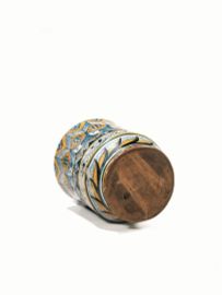 in maiolica decorata in policromia, corpo cilindrico appena rastremato al centro, spalla pronunciata dal profilo fortemente inclinato. L’imboccatura, dall’orlo dritto, si apre su un collo cilindrico piuttosto alto; il piede, basso, è a base piana. Il corpo ceramico color beige chiaro è coperto e smaltato anche all’interno del vaso. La decorazione mostra al centro del vaso un amorino che danza suonando il liuto su un prato, compreso in una riserva che ne segue il profilo. Intorno corre per tutto il resto del corpo un tessuto decorativo a losanghe arancio e blu dall’andamento simmetrico. Un motivo a baccellature interessa la spalla, mentre sul piede corre una corona di foglie lanceolate coerente. Nel cartiglio farmaceutico delineato in blu si legge DIACINAMOMO, un preparato a base di cannella: antiossidante, antipiretico. Per forma e caratteristiche decorative, si ritiene che l’opera si possa inserire nella produzione di manifatture pesaresi dei primi decenni del secolo XVI, alt. cm 25, diam. bocca cm 11,2, diam. base 12.