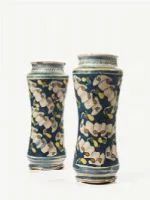 in maiolica decorata a policromia con motivo araldico sul fronte: il vaso presenta corpo cilindrico con base carenata e piede piano definito a stecca; spalla stretta e angolata, bocca ampia con orlo appena estroflesso. La superficie è interamente ricoperta da smalto color crema azzurrato, su cui è tracciato un motivo a nastri ripiegati dal profilo netto, delineati a risparmio su fondo blu. Sul fronte un emblema con un braccio che porta tre boccioli. L’albarello per morfologia e decoro può essere riferito alla produzione trapanese della fine del secolo XVII, alt. cm 28,4, diam. bocca cm 9,8, diam. piede cm 9,8
