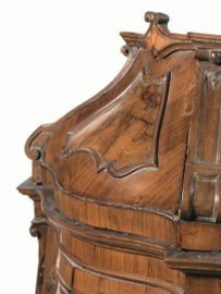 in noce e radica di noce a patina chiara; alzata lievemente bombata con due sportelli decorati da cornici sagomate, sormontata da terminale anch’esso di linea mossa e inquadrato da lesene mistilinee, che si ripetono anche negli elementi sottostanti; corpo inferiore semicircolare caratterizzato da un grande cassetto nella fascia e due sportelli sottostanti analogamente decorati; piedi a voluta stilizzata, alt. cm 243, profondità cm 73