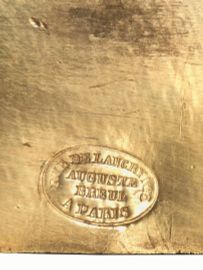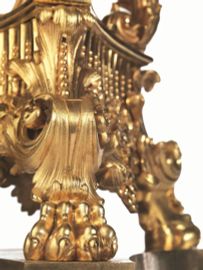 in bronzo dorato a dodici luci. Su una pedana liscia triangolare poggiano tre zampe ferine che sorreggono un'alta base, decorata agli angoli da foglie accartocciate e sui tre lati da ricchi fregi vegetali e costolature baccellate. Dalla base si erge una colonna centrale interamente decorata a motivi vegetali, e circondata da tre tralci a tutto tondo impreziositi da altrettante figure di putti con coppe e grappoli d'uva, sulla quale poggia l'alzata, decorata tutt'intorno da motivi vegetali e grappoli d'uva: dal suo interno si diaprtono dodici bracci portacandela di forma sagomata. Sulla base reca il punzone AUGUSTE BREUL - RUE DE LANCRY N. 5 - A PARIS, alt. cm 84, diam. cm 54