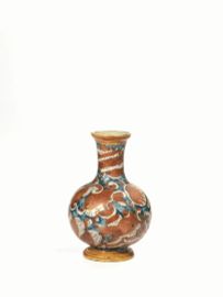 in maiolica dipinta in policromia, con corpo globulare, alto collo e imboccatura dall’orlo estroflesso; presenta la caratteristica decorazione a trofei delineati in blu su giallo arancio, mentre sul fronte una riserva comprende l’immagine di un angelo che sostiene un globo crucifero. Sulla parte bassa corre un cartiglio con la scritta farmaceutica “AQ.DI.VIOLE” in caratteri capitali, sotto al quale è dipinto il simbolo della farmacia a forma di cuore con la sigla “C.R.D.”; alt. cm 21, diam. bocca cm. 6,2, diam. piede cm 8,5