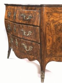 in noce e radica di noce, fronte e fianchi mossi decorati da filettature sagomate, piano decorato da motivi romboidali; tre cassetti sul fronte con maniglie e bocchette in bronzo cesellato e dorato di ispirazione vegetale, pendaglina sagomata, gambe a sciabola calzate da piedi in bronzo cesellato e dorato a motivi fogliacei, cm 85,5x145x57,5