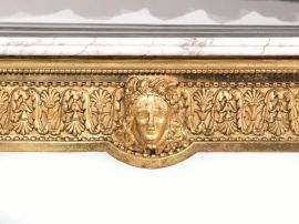 in legno intagliato e dorato con piano rettangolare in marmo bianco; fascia inquadrata da motivo a perline e decorata a racemi fogliacei alternati a palmette, centrata da volto femminile coronato di fiori; ai quattro angoli fiori entro riserve rettangolari, gambe troncoconiche scanalate decorate da foglie di acanto, cm 84x134x64