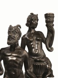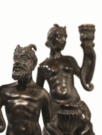 in bronzo a patina scura montati su alte basi quadrangolari in broccatello giallo. Il satiro raffigurato con sembianze maschili, seduto su un tronco, regge nella mano sinistra un calamaio a forma di vaso baccellato, mentre nella destra sollevata tiene il candeliere reso in forma di cornucopia; il satiro con sembianze femminili, anch'esso seduto su un tronco, solleva nella mano sinistra un candeliere analogo a quello del maschio, mentre con la mano destra sembra offrire un frutto, cm 47x19x15 (alt. cm 33 le sculture) (2)