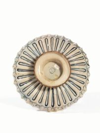 in maiolica dipinta in policromia, tipica foggia a larghe baccellature che convergono a raggera verso l’umbone largo e costolato, poggiante su un alto piede appena svasato. Il retro è interamente smaltato e mostra un motivo decorativo in blu, a sottolineare le baccellature. Sul fronte è descritta una scena istoriata che riproduce l’episodio Virgiliano di Metabo e Camilla: Metabo, re dei Volsci, inseguito dai nemici e impossibilitato ad attraversare il fiume Amaseno con la figlioletta in braccio, la lanciò sulla sponda opposta legata ad un giavellotto, dopo averla consacrata alla Dea Diana. Lo stile pittorico ci pare molto prossimo a quello di un pittore anonimo, noto come “il pittore di Zenobia”, o almeno ad un artefice a lui molto vicino. Tale attribuzione sembra essere confermata da Carmen Ravanelli Guidotti, che cita una crespina con Metabo e Camilla tra le opere ascrivibili alla bottega pesarese (C. Ravanelli Guidotti, Collezione Chigi Saracini. Maioliche Italiane, catalogo della mostra, Firenze/Siena 1992, pp. 100-108 n. 22). Numerose sono ormai le opere che si raccolgono attorno a questa personalità artistica attiva a Pesaro alla metà del secolo XVI. Questa crespina sotto il piede reca un’etichetta “WILLIAM RIDOUT COLLECTION” con l’iscrizione “U 6” aggiunta a matita, ad indicare la provenienza dalla celebre raccolta William Ridout, dispersa in un’asta londinese nel 1938; alt. cm 7,2, diam. cm 27,5, diam. piede cm 12,4