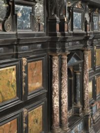 in legno decorato in pietre dure e marmi con applicazioni in bronzo, di forma architettonica con fronte a otto cassetti e anta centrale sormontata da timpano e inquadrata da due colonne celante altri dodici cassettini con pomelli in avorio, uno dei cassetti reca un cartiglio con scritta "Cav. Giovanni Battista Gatti - intarsiatore in avorio ebano pietre dure ecc. - Via Sistina 47", cm 77x133x42