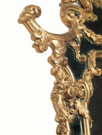 di forma sagomata con cornici in legno dorato, scolpito e intagliato con motivi vegetali; la cimasa sormontata da conchiglia con pennacchio e mascherone muliebre, sotto al quale sta un cesto pieno di fiori; cappello terminante alle estremità in grandi volute, sotto le quali si trovano profili di mascheroni barbuti, dai quali a loro volta scendono festoni di fiori attorcigliati alla cornice esterna e foglie a quella interna; grembiale centrato da mascherone femminile con fiori e foglie, zampe ferine con grandi volute e conchiglie rocaille sormontate da cestini di fiori e foglie, cm. 360X210; specchi della fascia esterna lievemente azzurrati; specchio centrale di epoca più tarda.