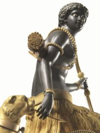 in bronzo patinato e dorato; base ovale decorata a rilievo con scene di putti che giocano e festoni, quadrante circolare in smalto con numeri romani per le ore e piccoli numeri arabi per i minuti firmato Piolaine à Paris, sormontato da figura femminile seduta raffigurante l'Africa affiancata da leonessa e tartaruga. Questo modello è attribuito a Jean-Simon Deverberie, cm 46x36x13