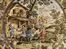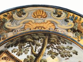 in maiolica decorata in policromia a gran fuoco con verde ramina, bruno di manganese, blu di cobalto, giallo antimonio e dorature, iscritto sulla tesa “NEAPOLI An.1727” “ Dr. Fra. Ant. Xav. Grue pinxit”. Il corpo del grande piatto in terracotta è ricoperto da uno strato di smalto stannifero dal colore leggermente beigiato. Il retro presenta una finissima crettatura con molte pulci e punte di spillo. Tutto l’ornato è disegnato con una sottilissima linea bruno-arancio (ad esclusione delle fronde arboree e delle parti poi dipinte in blu). La tavolozza dei colori a gran fuoco mostra una scala cromatica dominata dal verde, che vede toni chiari dall’accento olivastro, e dal bruno con stesure beige molto chiare. Il bruno scuro del manganese disegna i dettagli e modella i volumi. Le vesti dei protagonisti portano un beige aranciato e blu chiaro. Lumeggiature auree profilano l’intero tessuto decorativo puntinando gli elementi della tesa, le ali e i tessuti dei putti, oltre ad arricchire tessuti e gioielli delle donne sedute al tavolo e, infine, le fronde fogliate. Il grande piatto tondo ha la tesa leggermente inclinata e l’orlo liscio, mentre la balza scende addolcendo il passaggio al fondo liscio. La tesa è riccamente decorata: l’orlo esterno è profilato con una sottile bordura blu accompagnata da filetti manganese, blu e giallo, la fascia maggiore della tesa vede, sul fondo giallo, quattro importanti elementi barocchi, a cartouche, dominati da conchiglie con ciuffi fogliati, fiori e frutti accompagnati da putti in movimento. I due più in alto sono a mezza figura in scorcio e quello a destra si mostra espressivo mentre gioca con un insetto. Altre “zanzare” abitano i piccoli spazi liberi della tesa. La scena vede protagoniste cinque persone sedute a tavola all’aria aperta davanti ad una locanda, mentre stanno mangiando, servite da due giovani osti: la ragazza con l’abito blu porge un piatto, mentre un giovane uomo versa il vino in un calice. Tre figure sedute ci voltano le spalle: un uomo, un ragazzino e una signora dalla veste arancio decorata con una puntinatura dorata. Davanti a lei vi è la donna più giovane: una ragazza elegante che sembra rivolgere serenamente il suo sguardo verso l’osservatore; le è accanto il giovane uomo sorridente che porge il proprio calice all’oste. La scena centrale deriva sicuramente dal mondo pittorico olandese del pieno Seicento: pare affine alle raffigurazioni delle feste popolari, le “Kermesse”, di David Teniers le Jeune e delle locande del contemporaneo Adriaen Van Ostade, dove incontriamo edifici dalle facciate con muri sbrecciati e tettoie molto simili alla nostra, ma le narrazioni popolari che le animano sono più pauperistiche. La dimensione del nostro piatto e la ricchezza decorativa rendono il pezzo unico. La scritta che sigla e data in un nastro sulla tesa è presente su pochi altri pezzi, il più celebre dei quali è un tondino conservato al Museo di San Martino di Napoli (“1718”) schedato da Fittipaldi. La formula scrittoria di dieci anni precedente è molto più leggera e corsiva della nostra, ma Francesco Saverio usa più spesso lo stampatello. La curiosa formula della “N” specchiata della parola Napoli e quella del numero “7” nella data (con la linea superiore orizzontale), però, non incontrano simili nella grande quantità di parole che Francesco Antonio dipinge sui pezzi per manifestare la propria cultura. In un’opera di questa complessità pittorica, tuttavia, questi errori calligrafici non devono essere sopravvalutati, anche se non riusciamo a comprenderne la causa; alt. cm 4; diam. cm 33,2