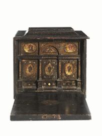 in legno ebanizzato, intagliato e lumeggiato in oro; parte superiore a urna da alzarsi con vano segreto e cassettino, sportello a ribalta sulla fronte celante interno a prospetto architettonico con tre grandi cassetti centrali ed un cassetto sottostante, decorati con intarsi in madreperla dipinta e inquadrati da colonne su plinto, cm 30x35x26