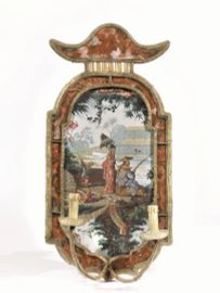 di forma sagomata ad imitare una pagoda, in legno con cornici in vetro dipinto a finto marmo e impreziosito nei profili da cordoni in perline dorate; cartella centrale decorata da una scena a cineserie dipinta su carta, due bracci ricurvi con piattello reggono le candele, cm 77x37 (4)