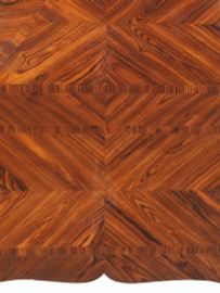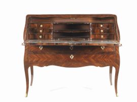 in noce impiallacciato in bois de violette; ribalta sagomata celante sei cassettini su due file centrati da vano a giorno diviso in tre ripiani, sul fronte due piccoli cassetti appaiati e un altro cassetto sottostante, gambe a sciabola con applicazioni in bronzo dorato, cm 97x110x56