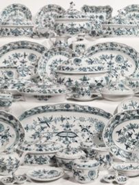 in porcellana bianca con decoro "a cipolla" in blu, composto di trecentoventi pezzi. Il decoro presenta tonalità di blu di intensità diversa (319).