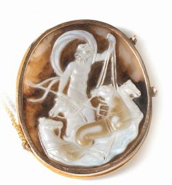 composta da tre cammei in calcedonio, di cui uno doppio, uniti da catenine in oro giallo e peridoti sfaccettati, 53 g entro scatola Mazzoleni una frattura in un cammeo