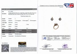 ciascun orecchino disegnato come una corolla con petali in rose di diamante e al centro una perla naturale; l'anello en suite corredata di certificato GCS n. 5775-972 datato 7/11/2014
