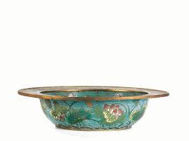 in metallo cloisonné decorato all'interno con pesci e all'esterno con motivi floreali, diam cm 28
