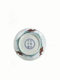 in porcellana Doucai, la parte centrale decorata con un drago contorto con la coda a cinque punte, l'esterno decorato con pesci che saltano tra le onde, un piattino recante marchio Chenghua diam cm 11,5