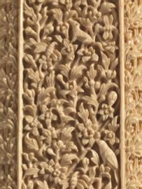 in avorio finemente intagliato con motivi floreali e piccole farfalle, scoiattoli e volatili , cm 6x58,5 (2)
