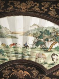 A WOOD PANEL CHINA 19TH CENTURY WITH A FAN SAHPE, HORSE IN LANDSCAPE,