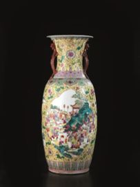 in porcellana policroma della famiglia rosa, decorato con motivi floreali e riserve decorate scene di corte alt. cm 62, 5