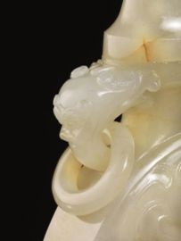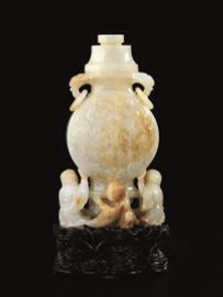 in giada bianca con inclusioni color ruggine, modellato nella forma di moon-flask sorretta da tre bambini, decorata a rilievo con motivo di taotie, le anse a forma di drago con anelli, alt. cm 17, poggiante su base in legno