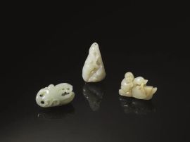 Due intagli, Cina sec. XIX, uno raffigurante piccolo pipistrello, l'altro modellato nella forma di un bimbo che abbraccia un' anatra , lung. cm 4; alt. cm 3 (2)