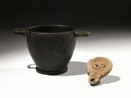 Testina diademata, alabastron etrusco-corinzio e skyphos a vernice nera
