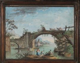 PAESAGGIO CON PASTORELLE E PESCATORE IN RIVA AL FIUME