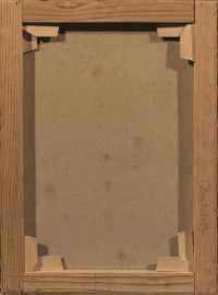 Si tratta di un bellissimo ritratto di donna, dal volto assorto, le labbra carnose, perfettamente disegnate dal rossetto vermiglio, i capelli scuri pettinati con grazia e volume, l'incarnato luminoso che si profila sull’elegante cappotto dal collo di pelliccia, mentre si stagliano sullo sfondo luminosissime le calle, fiori tra i preferiti dell’artista livornese, come si può vedere in tantissime sue opere di cui citiamo Calle con conchiglia, olio su tela, cm 61,5x44, collezione privata, e in Fiori di calle recise in vaso, olio su tela, cm 50,6x48. Della gentile Signora non conosciamo l'identità, ma sembra essere la stessa donna che il pittore ha ritratto in un'altra opera di piccole dimensioni, anche questa anonima, in collezione privata, pubblicata in Ottocento italiano. Opere e mercato di pittori e scultori. 2, a cura di M. Agnellini, Milano 2000, p. 167, e in Novecento italiano. Opere e mercato di pittori e scultori 1900-1945, a cura di M. Agnellini, Milano 2000, p. 147.