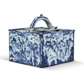 in maiolica in maiolica dipinta in monocromia blu, corpo di forma quadrangolare con quattro vani separati e manico ad arco per la movimentazione. Il decoro vede scene istoriate del tipo istoriato barocco con storie e protagonisti differenti disposte su tutti i lati. Lo stile è rapido, realizzato con grande quantità di pigmento e di smalto tanto da causare alcune colature in cottura. L’opera ci pare prossima per qualità e stile alla produzione della manifattura Conrado, alla quale si può attribuire pur in assenza di marca sotto la base, lasciata priva di smalto; cm 20,4x20x20