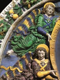 Quest’animata, rutilante lunetta invetriata, che vanta una cospicua letteratura critica concorde nell’assegnarla a Giovanni della Robbia e una ragguardevole vicenda collezionistica essendo appartenuta al Kunstgewerbe Museum di Colonia, si pone fra le più rappresentative testimonianze del maestro confluite sul mercato antiquario negli ultimi decenni. Giovanni - che fu il più autonomo e prolifico tra i numerosi figli ed eredi nell’arte di Andrea della Robbia, dal quale si distingue per una spiccata esuberanza cromatica e ornamentale, ma anche per una maggiore vivacità formale di matrice verrocchiesca - rivela infatti in quest’opera le sue doti migliori, immune dalle frequenti contaminazioni di un’operosa bottega. Le cogliamo nella notevole qualità del modellato, forbito nella definizione arguta dei volti ricciuti, vibrante nello sviluppo dei panneggi sbattuti dal vento, nella fantasiosa e raffinata vena decorativa delle vesti, impreziosite da monili e ricami, nel rigoglioso festone vegetale che percorre la cornice sorgendo da due eleganti vasi all’antica, come pure nelle tonalità vivide e nel virtuosismo tecnico dell’invetriatura, che ottiene effetti naturalistici negli incarnati e cangianti screziature nelle ali, tinteggiando nel cielo cirri vaporosi.