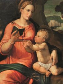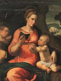 Questa bella tavola dal raffinato cangiantismo, che apparirà ancora più brillante una volta rimossa la vecchia vernice ingiallita, va senza dubbio riferita alla mano di Giovanni Capassini, pittore fiorentino che svolse la sua attività in Francia nel terzo venticinquennio del Cinquecento: dipinse al servizio del cardinale di Tournon e poi a Lione e ad Aix en Provence. Oltre le evidenti tangenze stilistiche con i pochi dipinti certi di Giovanni Capassini come La Sacra Famiglia con san Giovanni Battista e santa Caterina, del Musée des Beaux-Arts di Nimes, o le tavole laterali del trittico di Tournon, oggi conservate al Museo del Louvre, il riferimento più diretto per l’attribuzione è con un disegno preparatorio pubblicato da Jean-Cristophe Baudequin nel 2004. Il foglio raffigura nel verso il volto di un bambino, mentre nel recto vi è invece disegnato Gesù nella medesima posa di questo dipinto. Baudequin, non conoscendo la tavola, riferiva il foglio ad una Madonna col Bambino e san Giovannino della Gemäldegalerie di Berlino (cat. nr. 277) che era stata già attribuita a Capassini da Luciano Bellosi nel 1994. La composizione della tavola berlinese appare quasi identica a quella di questa tavola, dove tuttavia, oltre alla pittura più salda e monumentale, vi sono alcune significative varianti sia nel paesaggio, sia nella posa del bambino, qui raffigurato con entrambe le gambe piegate, esattamente come nel foglio preparatorio conservato all’École Nationale Supérieure Des Beaux-Arts di Parigi, mentre nella tavola tedesca la gamba destra viene rappresentata distesa.