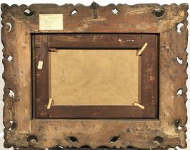 coppia di dipinti ad olio su tela, cm 42,5x59,5, entro antica cornice intagliata ad eleganti motivi fogliacei