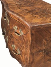 in noce, radica di noce e altre essenze, fronte bombato a due cassetti decorato al centro da filettatura rettangolare attorno alla quale si arrampicano rami e foglie; analoga decorazione si trova sui fianchi mossi e sul piano sagomato; gambe sinuose, maniglie in bronzo dorato e cesellato, cm 90x134x67