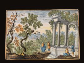 in maiolica dipinta in policromia a raffigurare scene campestri con viandanti, rovine e palazzi in paesaggio collinare e lacustre, cm 18,6x27,2 e cm 18,2x26,8. Montate entro cornice in legno (2)
