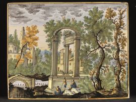 in maiolica dipinta in policromia a raffigurare scena paesaggistica con personaggi e resti architettonici di un tempio antico, alberi in primo piano e sullo sfondo una città turrita e un paesaggio lacustre, 21,5x27 e cm 21x27. Montate entro cornice in legno (2)