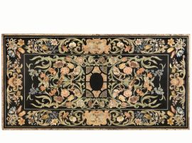 decorato in policromia, sulla cornice si susseguono motivi a volute, fiori, frutti e uccellini con due cartigli sui lati lunghi; al centro analoghi motivi decorativi inquadrano una composizione geometrica; basi in pietra ad asso di coppe; cm 107x208, alt. con le basi cm 81
