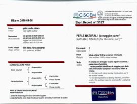 realizzata ad un filo di centoundici perle naturali poste in gradazione diam. da 3 mm a 8.5 mm, fermatura allungata decorata da rubini e brillanti taglio vecchio, corredata di certificato CISGEM n. 3127, datato 06/04/2016, 19 g