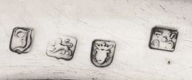 in argento con tese sagomate decorate da baccellature e stemmi nobiliari, diam. cm 24, complessivi g 3410 (6)