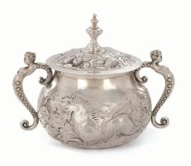 di forma bombata, in argento, corpo decorato da un leone ed un unicorno tra foglie, due anse realizzate come figura femminili, finale del coperchio a trottola, alt. cm, 17, g 755, entro scatola